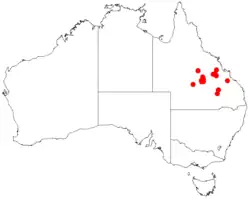 It is found in a small area of inland east-central Queensland mostly from a couple of localities around Emerald where it is situated in red soils often present as dense stands as a part of woodland communities where it is often associated with species of Eucalyptus[2] and other species of Acacia. The tree is usually found among rocky sandstone ridges and on hills in sandy to loamy soils at altitudes of 400 to 600 m (1,300 to 2,000 ft) over an area of around approximately 205,000 km2 (79,000 sq mi) from north of Aramac to about Roma in the south.[1]
