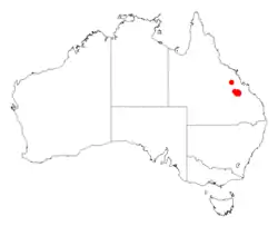 It is endemic to the Central Highlands Region of Queensland where it has a limited distribution along the Blackdown Tableland and lower plains along the western side of the tableland area. It is mostly situated on sandstone plateaux as a part of open forest communities often along with Acacia gittinsii and Acacia hendersonii.[2] The bulk of the population is found within the National Park with three smaller populations found near Rockland Spring, along upper Davy Creek and to the north east of Woorabinda. Other associated species are Eucalyptus tereticornis, Eucalyptus cloeziana and various species of Aristida.[1]