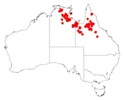 It is found in the Gulf country of north western Queensland as far east as Croydon extending to the west into the top end of the Northern Territory to around Darwin. It is commonly found alongside creeks and rivers and at base of sandstone hills growing in deep sandy soils in scrubland communities often is association with Melaleuca viridiflora.[1]