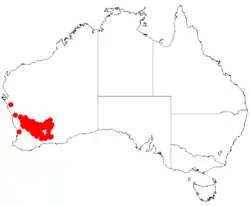It is endemic to an area in the Whearbelt and Goldfields regions of Western Australia where it is found on sandplains, rocky rises and flats growing in sandy, loamy, clay or gravelly soils.[2] The species is found between Wubin in the north and extends in a south easterly direction down to around Peak Charles National Park where it is a part of mallee heath and open shrubland communities.[3]