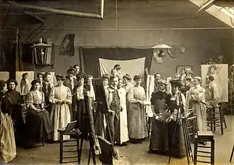 Teachers included Paul Gauguin (1848–1903), Luc-Olivier Merson, Frederick MacMonnies, Jacques-Émile Blanche (1861–1942) and Hermenegildo Anglada Camarasa (1871–1959).[1] In March 1903 Walter Sickert (1860–1942) began teaching again in Paris, probably at the Académie Vitti with Blanche and Lucien Simon (1861–1945).[3] Kees van Dongen (1877–1968) influenced many of his female students at the academy with an interest in fauvism.[4] He showed artists such as Tyko Sallinen (1879–1955) and Ragnhild Kaarbø (1889–1949) a direction that would lead to Nordic expressionism.[5] Other teachers at the academy were Paul Gervais (1859–1934) and, as an assistant, María Blanchard (1871–1959).[6] Maria Blanchard studied at the academy under Kees van Dongen and Hermén Anglada Camarasa.[7]