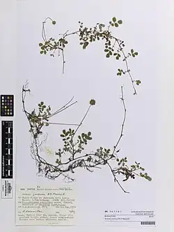 This plant has slender reddish brown branches, often growing prostrately, each ending in three distinctively rounded leaflets which are green, not glaucous as in many of its congeners. This species is usually found at the margins of forests of broad-leaved trees such as Nothofagus and in scrubland dominated by Leptospermum scoparium and Kunzea ericoides. Flowering occurs from November to February with fruit being produced from January onwards.
