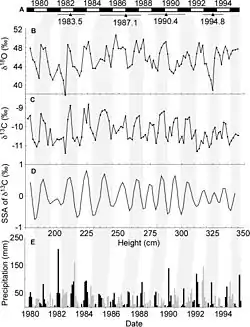 For example, columnar cactus spines grow from the apex of the plant. After several weeks the spines stop growing and have been moved to the side of the stem. The old spines remain in place for decades as new spines are created at the continually growing apex.[1] The result is that along each external "rib" of the cactus is a series of spines arranged in the order they grew in – the oldest spines are at the bottom and the youngest spines are at the top. These spines can be dated using bomb-spike[2] Carbon-14 and isotopes of carbon (Carbon-13) and oxygen (Oxygen-18) may be used to infer past climate[3] (e.g. precipitation or temperature), plant stem growth[4] or plant physiology (e.g. photosynthetic processes).[5] Alternatively, the width of small transverse bands[6] in the spine may be used to infer daily information about cloud cover or plant productivity, although this remains to be tested. It has also been shown that regular waxy banding on the sides of a Costa Rican cactus (Lemaireocereus aragonii) indicate annual growth and can be used as temporal chronometers.[7]