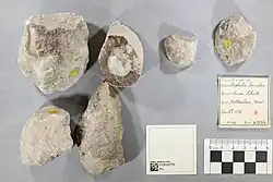 A partial nodosaur skeleton from the Gault Formation in Kent, which had been scavenged by sharks shortly after the animal had died, was discovered and excavated between 2000-01 and it has been tentatively assigned to Acanthopholis.[11] The specimen consists of osteoderms, vertebrae, parts of the sacrum and parts of the limbs and it is currently on loan from a private collection and is on display at the Maidstone Museum.[11]