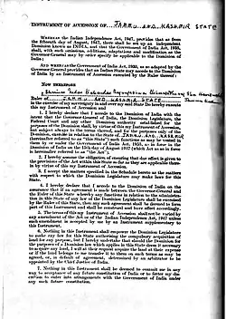 | Significance | Accession of the princely state of Jammu and Kashmir |
