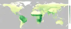 | Diversity map of Accipitriformes (258 species). The colour gradient (from light to dark) indicates species richness.[2] | |