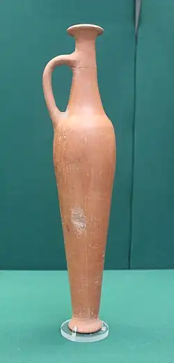 Such items reflect cultural and commercial connections of the settlement, as well as its chronology. These small bottles appear mainly in funerary contexts, and sometimes also in domestic and public contexts. Their shapes can be either of a long alabastron type, or of a globular type. These bottles were probably used as containers for medicinal oils or perfumes.[3]
