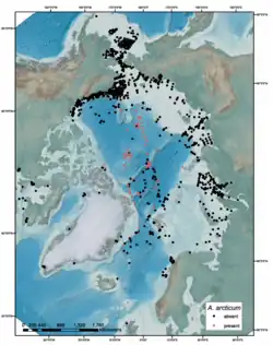largely occupies the Central Arctic Ocean due to its perennial sea-ice conditions. There are recorded occurrences in Nansen Basin, Amundsen Basin and Makarov Basin.[5] Latitudinally, it has been reported to be found in high abundance beyond 85°N, although they exist beyond 75°N.