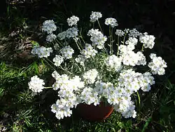 Achillea ageratifolia, the Balkan yarrow or Greek yarrow, is a species of flowering plant in the daisy family Asteraceae, native to Bulgaria and Greece. Growing to 20 cm (7.9 in) tall and broad, it is a compact herbaceous perennial. It is a highly variable species, with three recognized subspecies. They have erect, simple, somewhat woody based stems.[4] The narrow grey-green foliage resembles that of a related genus Ageratum, hence the Latin specific epithet ageratifolia.[5] The solitary, daisy-like composite flower heads are white with yellow centres and about 2–3 cm across.[6] They appear May–July in the northern hemisphere.[7]
