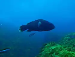 This species prefers areas with rocky substrates and can be found at depths of from 1 to 65 m. Their diet consists of other fishes, crabs, lobster, various molluscs including abalone, and starfish. This species grows to a length of 175 cm (69 in).[2] Weights of up to 40 kg (88 lb) have been recorded.[3] It has been recorded living for up to 70 years, making it the longest lived wrasse species recorded alongside the foxfish.[4] They have a single long-based dorsal fin, a large squarish tail, thick fleshy lips, large heavy scales and peg-like teeth.[5]