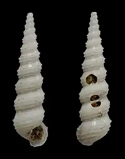 (Original description in Latin) The shell is umbilicate (with a covered navel), very slender, attenuated (tapering), and white. It has 13-14 whorls. The three apical whorls are small, very light, and glassy. The remaining whorls are very impressed at the sutures, ventricose (swollen), and tightly keeled all over with spiral small ridges. The upper whorls have two keels, the second-to-last and third-to-last have three, and the body whorl has four. The surface itself is smooth and shiny. The aperture is almost round, and the outer lip is slightly expanded at the base and nearly continuous. [2]