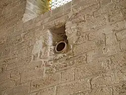 The use of the jars was said to be common in Brittany, and around Clisson, in the Loire Inferieure. In the Clisson area, they were usually found in horizontal rows at a height of about three metres above floor level.[9] In 1859 a correspondent to Archaeologia Cambrensis reported that at Pallet there was "a modern chapel, with earthenware vessels inserted in the walls of the choir, expressly for acoustic purposes".[9] In England, a set of eleven jars survives high in the chancel walls of St Andrew's Church at Lyddington, Rutland.[10]