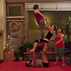 Acrobalance is a floor-based acrobatic art that involves balances, lifts and creating shapes performed in pairs or groups.[1] A performer on the ground doing the lifting and supporting in an acrobalance formation is often called the base, while a performer being lifted or tossed can be referred to as the flyer (or flier). Formats include male/female duo, trio, female/female, and other variations.