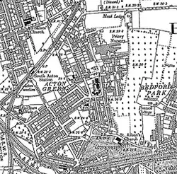 Facing the east of the common is St Michael and All Angels, Bedford Park; it and The Tabard Inn facing it across Bath Road, were built in 1880.[6][7] The 1894 Ordnance Survey map shows Acton Green bounded to the west by railway lines, and to the east by the boundary of Bedford Park; at that time, both the west of Bedford Park and the east of Acton Green consisted of orchards.[8]