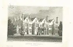 The Corbet family abandoned nearby Moreton Corbet Castle as a residence in about 1800 after their 17th-century hall had been enlarged and improved for their occupation. Sir Andrew Corbet retained architect John Hiram Haycock (1759–1830), who created the new mansion in a Neo-Jacobean style.[1] The seven-bayed, three-storey eastern entrance front retains three bays and a Tuscan portico dating from 1610 and 1625.[2] The main block, dating from about 1800, was later extended by service wings in about 1840 and other improvements in 1893.[1]