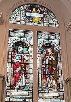 There are three stained glass windows by W. and J. J. Kerr in the west wall, above the balcony. They show Christ and the Wise Virgins; Timothy and his Mother; Paul and Isaiah.[26] Christ and the Wise Virgins was dedicated by James Wilson, Provost of Govan, in memory of his sister-in-law Victoria Graham Taylor who died in 1873 at the age of 19.[27] Timothy and his Mother was dedicated by one Herman Bowser in memory of his wife and son.[27] They were described by the North British Daily Mail as being in 'the first rank of modern works.'[27]
