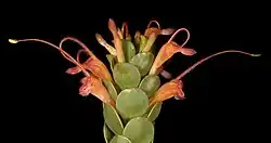 The species is very similar to A. barbiger. There are obvious differences in typical leaf shape, with leaves of most populations of A. barbiger being very much longer and narrower than those of A. obovatus. However, leaf shape is variable in both species, and some southern populations of A. barbiger have leaves that are indistinguishable from those of A. obovatus. The most systematically important properties by which the two may be distinguished are the shape of the perianth limb, which is rounded in A. obovatus and pointed in A. barbiger; the bracts, glabrous versus hirsute; and the style-ends, which are green and scarlet respectively. The species also differ slightly in range of flower colours: A. barbiger has scarlet to bright red flowers, whereas A. obovatus flowers are scarlet to orange.[4]