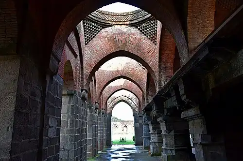 Over the course of 114 years, nine kings ruled Bengal from Pandua. All of them were from the Ilyas Shahi dynasty, with the exception of Raja Ganesha, his son Jalaluddin Muhammad Shah, and grandson Shamsuddin Ahmad Shah. They built palaces, forts, bridges, mosques, and mausoleums, many of which are now in ruins or have disappeared completely. Sultan Sikandar Shah commissioned the construction of the Adina Mosque after Bengal's victory in the Bengal Sultanate-Delhi Sultanate War. The Adina Mosque was modeled on the Great Mosque of Damascus and became the largest mosque in the Indian subcontinent. Sultan Jalaluddin Muhammad Shah was buried in the Eklakhi Mausoleum, which is an example of terracotta Bengali architecture. The royal palace had high steps, nine walls, three gates, and a durbar room. A contemporary account describes the durbar room as having pillars plated with brass, carved, polished and ornamented with figurines of flowers and animals; the king sat cross-legged on an elevated throne decorated with precious stones and a two-edged sword laying across his lap. The Sultans of Bengal imitated Persianate court traditions.[4] According to the Ming ambassador Ma Huan, Pandua was transformed from a small hamlet into a cosmopolitan capital and trade center, as well as a military garrison. The population included royalty, aristocrats, soldiers, mercenaries, natives and Eurasian travelers and merchants who either settled or were a floating population along trade routes. Ma Huan wrote that "the city walls are very imposing, the bazaars well-arranged, the shops side by side, the pillars in orderly rows, they are full of every kind of goods". Pandua was a center of production and marketing. At least six varieties of fine muslin, as well as silk products, were found in Pandua's markets. There were four types of wine. High-quality paper was produced from the bark of mulberry trees in the area surrounding the capital. The paper resembled lightweight white cotton cloth.[5]