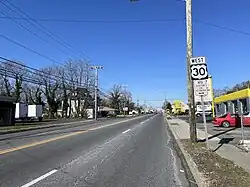 At the former Collingswood Circle, US 30 splits from US 130 by heading south-southeast on two-lane, undivided White Horse Pike.[1] The road passes homes and some businesses before crossing the Newton Creek into Oaklyn, where it passes suburban residential and commercial development.[1][3] US 30 forms the border between Oaklyn to the west and Haddon Township to the east before heading into Audubon. At the border of Audubon and Haddon Heights, the route crosses CR 551 Spur.[1] In this town, the White Horse Pike reaches an intersection with Route 41 at a modified traffic circle and an interchange with I-295 within a close distance of each other in Barrington.[1][3] At this point, the route is four lanes wide, with a short divided portion immediately south of I-295.[1]