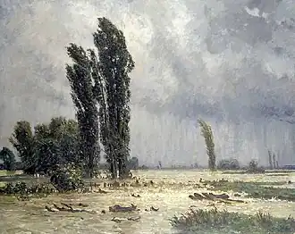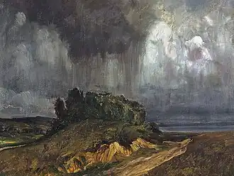 Later, he visited Dresden, Milan and Paris, where he came into contact with French landscape painting at the Exposition Universelle (1867) and visited the artists' colony at Barbizon.[2] After his father's death, he settled permanently in Munich; becoming part of a circle of Swiss artists that included Arnold Böcklin and Otto Frölicher as well as the art historian, Adolf Bayersdorfer.[1] In 1882, he made a lengthy visit to Italy. He generally made sketches en plein aire during the summer and turned them into paintings at his studio in the winter. One of his best known works "Rising Thunderstorm" was painted on commission by the government of Aargau and may be seen at the Aargauer Kunsthaus.[2]