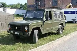 Another civilian version, called the Monteverdi 250 - Z, was derived from the Saurer F006 by Monteverdi, with engineering input from Berna. Saurer took over the production. The axles were reused from the International Scout. The vehicle had a plastic body made of polyester. For power, the drive-train was a 6-cylinder petrol engine from Volvo with an automatic transmission. Maximum speed was 100 km/h. Overall styling contrasted with the Mercedes G and Puch 230GE joint venture vehicle, with the front turn signals mounted conventionally on the front of the vehicle. The equipment installed in the front bumper parking lights can be turned by flicking the Tarnlicht switch, a multipurpose military switch for light dimming. The basic vehicle has a fixed open back cab. The passenger seats are closed with a fast removable plastic sheet at the rear, including a military holder for a gas canister; a fixed structure is provided for use in case of fire.