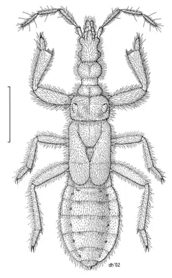 Aenictopecheidae is a rare family of insects occurring worldwide but containing only a few species, including a single American species, Boreostolus americanus. This species lives under large, flat stones and sandy substrates along mountain streams in Oregon, Washington, and Colorado. It is 5 mm long and occurs in both the macropterous and brachypterous condition. It is assumed to be predaceous.[1]