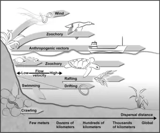 Dispersal is a vital component of an organism's life-history,[159] and the potential for dispersal determines the distribution, abundance, and thus, the community dynamics of species at different sites.[160][161][162] A new habitat must first be reached before filters such as organismal abilities and adaptations, the quality of a habitat, and the established biological community determine the colonization efficiency of a species.[163] While larger animals can cover distances on their own and actively seek suitable habitats, small (<2 mm) organisms are often passively dispersed,[163] resulting in their more ubiquitous occurrence.[164] While active dispersal accounts for rather predictable distribution patterns, passive dispersal leads to a more randomized immigration of organisms.[160] Mechanisms for passive dispersal are the transport on (epizoochory) or in (endozoochory) larger animals (e.g., flying insects, birds, or mammals) and the erosion by wind.[163][76]