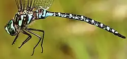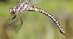 Adult Canada darners, similar to other members of the genus Aeshna, are relatively large, slender dragonflies, and are predominantly dark brown with paler blue or green markings.[4][5] Adults are 64 to 73 mm in total length.[5] The thorax has two vertical stripes on each side, the front with a prominent notch and an extension at the top.[5] The abdomen has spots on most segments.[5] The pale markings are usually blue in males and range from yellow-green to blue in females. The eyes are bluish in males and yellowish or bluish in females.[5] The pale markings may turn gray at colder temperatures.[5]