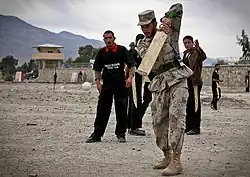 A member of the Afghan Border Police plays cricket after the ground breaking ceremony for the Ghulam Mohammad Sports Complex in Kunar Province.