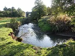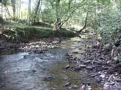 Leaving Rhiwsaeson, about a mile (1.5 km) east of Cross Inn, the Clun widens to between about eight feet (2.4 metres) and 12 feet (3.7 metres) and slows. Here, where the Clun flows to the south of Cross Inn, as well as along the banks of Nant Dowlais and Nant Myddlyn, evidence of otter activity has been noted.[6] The river flows to the south of the A473 Pontypridd to Bridgend (Penybont ar Ogwr) road (Talbot Green By-Pass), where it is fed from the south by Nant Mwyndy. Nant Mwyndy flows over a bedrock of Carboniferous Limestone, rising in Creigiau and, flowing westwards, immediately north of Groesfaen, passing a small industrial estate at Mwyndy, feeding a lake resulting from Victorian opencast iron mining (see History below) and turning south to flow past Cefn-y-Parc Cemetery, Penygawsi, before reaching its confluence with the Afon Clun.[7][8]