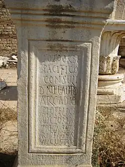 - Inscriptions from Tripolitania, written as late as the 10th or 11th century are written with a ⟨k⟩ before both front and back vowels, pointing towards the pronunciation /k/ in all environments. Thus, there are forms with k written before front vowels, such as dikite ("say", 2pl imperative), iaket ("he/she lies down"), dekember ("December") , pake ("peace"), lukeat ("may shine", 3sgl subjunctive), dekesit ("he/she went away/died"), okisum ("killed"), bikeisima ("twentieth"), loki ("the places", or "of the place"), innok(en)s ("innocent"), dulkissimus ("most sweet"), rekessit ("he/she rests") and rekiebit ("he/she rested".) These occur alongside examples written before back vowels or consonants, such as dilektus ("beloved"), karus ("dear") and Afrikana ("African").[89][90]