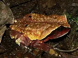 The African giant toad is a large species with a robust body which is a broad ovoid in shape. It has a short snout, an unridged crown and nearly-vertical sides to the head. The eyes are set close together and the upper eyelid has a pointed edge drawn out into a triangular projection. The tympanum is indistinct but the parotid glands are large. The first finger of the hand is longer than the second one, males having nuptial pads on the first two fingers. On the hind limbs, the toes are short and partially webbed. The skin on the back is either smooth or may bear small warts. The upper surface of the head and body is pale brown, yellowish or pinkish. There is a backwards-pointing V-shaped black mark between the eyes and there are sometimes one or more pairs of dark spots on the back. There is sometimes a thin, pale stripe running along the spine. The sides of the head and body are considerably darker than the upper parts. The underparts are grey speckled with white and there is a thin white line bordering the lower jaw. The limbs are barred with dark bands on a greyish or brownish background and the back of the thigh, and sometimes the flanks, are bright red.[6] The combined effect of this colouration is to make the frog resemble a dead leaf and it is well camouflaged when among the leaf litter on the forest floor.[7] The new species differs from the two subspecies in that the posterior part of the abdomen is a darker colour, the line along the spine is dark and the eyelid processes are less-pointed. It is also distinguished genetically from them. There is a 2.2 to 2.8% variation in the 16S rRNA gene, the gene used for investigation, between it and the two subspecies whereas the subspecies are genetically more similar to each other (0.9 to 1.1%) than either of them is to the new species (A. channingi).[4] A. s. chevalieri is the largest subspecies with adult males having an average snout-to-vent length of 127 mm (5.0 in) while A. s. superciliaris averages 121 mm (4.8 in). The new species is shorter again at 109 mm (4.3 in). Females are rather larger than males.[4]