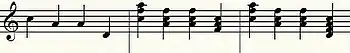 Arom Simha proceeds to note "We have already remarked that specific vertical combinations in each formula act as temporal reference points by virtue of their regular repetition at a given position in the periodic cycle. These combinations are the points at which several superposed melodic lines meet. They are usually based on octaves, fifths, and fourths, precisely the intervals which make up sections 1–4 of Chailley's resonance table (i960: 35), and this is certainly no accident. We may therefore assume that they take on a structural function." These vertical combinations that constitute reference points are chords that, together, form a chord progression. This is similar to the concepts of chords and progressions in cyclical forms in Jazz, Blues and other musics of the African diaspora.