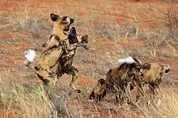 Lions dominate African wild dogs and are a major source of mortality for both adults and pups.[67] Population densities are usually low in areas where lions are more abundant.[68] One pack reintroduced into Etosha National Park was wiped out by lions. A population crash in lions in the Ngorongoro Conservation Area during the 1960s resulted in an increase in African wild dog sightings, only for their numbers to decline once the lions recovered.[67] As with other large predators killed by lion prides, the dogs are usually killed and left uneaten by the lions, indicating the competitive rather than predatory nature of the lions' dominance.[69][70] However, a few cases have been reported of old and wounded lions falling prey to African wild dogs.[71][72] On occasion, packs of wild dogs have been observed defending pack members attacked by single lions, sometimes successfully. One pack in the Okavango in March 2016 was photographed by safari guides waging "an incredible fight" against a lioness that attacked a subadult dog at an impala kill, which forced the lioness to retreat, although the subadult dog died. A pack of four wild dogs was observed furiously defending an old adult male dog from a male lion that attacked it at a kill; the dog survived and rejoined the pack.[73]