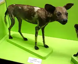 The African wild dog (Lycaon pictus), also called painted dog and Cape hunting dog, is a wild canine native to sub-Saharan Africa. It is the largest wild canine in Africa, and the only extant member of the genus Lycaon, which is distinguished from Canis by dentition highly specialised for a hypercarnivorous diet and by a lack of dewclaws.