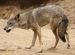 It was estimated that the African wolf diverged from the wolf–coyote clade 1.0–1.7 million years ago, during the Pleistocene, and therefore its superficial similarity to the golden jackal (particularly in East Africa, where African wolves are similar in size to golden jackals) would be a case of parallel evolution. Considering its phylogenetic position and the canid fossil record, it is likely that the African wolf evolved from larger ancestors that became progressively more jackal-like in size upon populating Africa on account of interspecific competition with both larger and smaller indigenous carnivores. Traces of African wolf DNA were identified in golden jackals in Israel, which adjoins Egypt, thus indicating the presence of a hybrid zone.[5] The study's findings were corroborated that same year by Spanish, Mexican and Moroccan scientists analyzing the mtDNA of wolves in Morocco, who found that the specimens analyzed were distinct from both golden jackals and gray wolves but bore a closer relationship to the latter.[6] Studies on RAD sequences found instances of African wolves hybridizing with both feral dogs and Ethiopian wolves.[47]