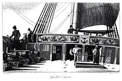 The aftercastle (or sterncastle, sometimes aftcastle) is the stern structure behind the mizzenmast and above the transom on large sailing ships, such as carracks, caravels, galleons and galleasses.[1] It usually houses the captain's cabin and perhaps additional cabins and is crowned by the poop deck, which on men-of-war provided a heightened platform from which to fire upon other ships; it was also a place of defence in the event of boarding. More common, but much smaller, is the forecastle.