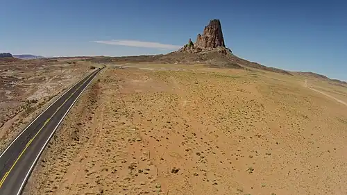 Agathla Peak or Agathlan (Navajo: Aghaałą́, Spanish: El Capitan) is a peak south of Monument Valley, Arizona, which rises over 1,500 feet (460 meters) above the surrounding terrain. It is 7 miles (11 km) north of Kayenta and is visible from U.S. Route 163. The English designation Agathla is derived from the Navajo name aghaałą́ meaning 'much wool', apparently for the fur of antelope and deer accumulating on the rock.[3] The mountain is considered sacred by the Navajo.