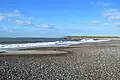 The North Sea coast is often windy and fierce, and Agger Tange has experienced many smaller floods during storms. In 1825, a severe storm breached and created what became known as the Agger Channel (in Danish: Agger Kanal or Aggerkanalen), effectually merging the North Sea with the brackish Limfjord permanently. The channel gradually widened, but closed up again during the 1850s, again due to natural siltation.[1] A similar breach occurred during a storm in 1862 at the nearby town of Thyborøn, south of Agger. This breach became known as the Thyborøn Channel, and to stop further erosion, both the Thyborøn Channel and the entire Agger Tange has later been fortified with coastal protection.[2][3] The southern part of the breached tombolo, across the Thyborøn Channel, is known as Harboøre Tange, referring to the railroad town of Harboøre at the south base of the peninsula.[4]