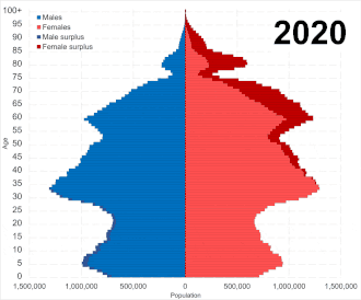 The natural population declined by 997,000 between October 2020 and September 2021 (the difference between the number of births and the number of deaths over a period).[25] The natural death rate in January 2020, 2021, and 2022 have each been nearly double the natural birth rate.[26]