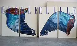 Beginning in 2007, Thurnauer produced a series of works, called Prédelle (the French term for predella). The Grande Prédelle incarnations, produced from 2008 to 2011, are diptychs, each depicting a large feathered wing along a deformation of the iconic title of the magazine Elle.[11] The title and subject convey a multiple play on words, simultaneously acting as a homonym for "près d'elle" and "aile", respectively meaning "close to her" and "wing" in French.[12] Cyclicly, each Grande Prédelle painting has its own palette glued to it as a finishing touch.[13]