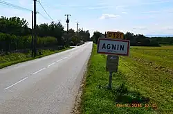 Agnin is located some 25 km south of Vienne and 5 km north-east of Saint-Rambert-d'Albon. It can be accessed by the road D519 from near Chanas in the west passing through the southern part of the commune and continuing to Bouge-Chambalud. Parallel to this road in the north of the commune is the D51 road from Salaise-sur-Sanne in the west passing through the commune and the village and continuing to Anjou in the east. The D131 also comes from the Ville-sous-Anjou in the north joining the D51 west of the village. The Route de Bouge connects the village to the D519 in the south of the commune. The commune is mostly farmland with significant areas of housing in the north and some small areas of forest in the south.[4]