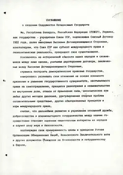 The Agreement on the creation of the Commonwealth of Independent States (officially), or unofficially the Minsk Agreement[1][2] and best known as the Belovezha Accords,[a] is the agreement declaring that the Soviet Union (USSR) had effectively ceased to exist and establishing the Commonwealth of Independent States (CIS) in its place as an organization created by the same Union Republics. The documentation was signed at the state dacha near Viskuli in Belovezhskaya Pushcha, Belarus on 8 December 1991, by leaders of three of the four republics (except for the defunct Transcaucasian SFSR) which had signed the 1922 Treaty on the Creation of the USSR:[3]