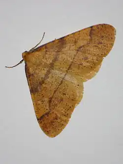 The males have normally developed wings. The forewings are dark golden yellow or orange yellow to light brown and dusted with many black scales. There are three brown-grey transverse bands the outermost broken. Sometimes there are large black patches in the postdiscal area. The hindwings have the same basic colour as the forewings, but are however always paler with two thin, dark lines. The antennae are double saw combed..[1] The male differs from its congeners in its bright golden-brown colour. Forma include — ab. fumipennaria Heilweger. Forewing infuscated (violet -brown), only the fringe yellow; hindwing also more or less smoky. male-ab. fasciata Linstoiv has a dark band distally to the postmedian line. [2][3]