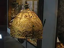 - The Casque d'Agris (Agris helmet) is a ceremonial Celtic helmet dating from the 4th century BC which was found in 1981 during archaeological excavations in the Perrats Cave, a Late Bronze Age site. The helmet was made with a shell of riveted iron covering the neck and gold plating on bronze decorated with plant motifs.[13] It is displayed in the Angoulême museum.