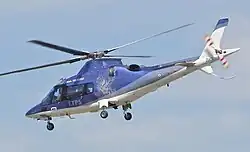 The AgustaWestland AW109, originally the Agusta A109, is a lightweight, twin-engine, eight-seat multi-purpose helicopter designed and initially produced by the Italian rotorcraft manufacturer Agusta. It was the first all-Italian helicopter to be mass-produced.[1] Its production has been continued by Agusta's successor companies, presently Leonardo, formerly AgustaWestland, merged into the new Finmeccanica since 2016.[2]