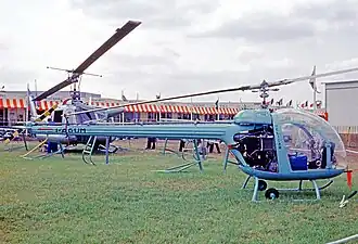 The A.104 was a slightly enlarged version of the A.103, and added a second seat beside the pilot's seat. The cockpit was enclosed by a perspex bubble with the engine at the rear and the tail rotor carried on an enclosed boom.