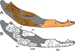 Though the mandible is not completely known, it was likely short and robust with a tall jaw joint based on the known bones and the anatomy of the upper jaw.[1]