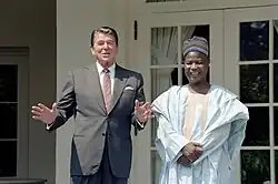 Ahidjo resigned, ostensibly for health reasons, on 4 November 1982 and was succeeded by Prime Minister Paul Biya two days later.[27] That he stepped down in favor of Biya, a Christian from the south and not a Muslim from the north like himself, was considered surprising. Ahidjo's ultimate intentions were unclear; it is possible that he intended to return to the presidency at a later point when his health improved, and another possibility is that he intended for Maigari Bello Bouba, a fellow Muslim from the north who succeeded Biya as Prime Minister, to be his eventual successor as president, with Biya in effectively a caretaker role. Although the Central Committee of the ruling Cameroon National Union (CNU) urged Ahidjo to remain President, he declined to do so, but he did agree to remain as the President of the CNU. However, he also arranged for Biya to become the CNU Vice-President and handle party affairs in his absence. During the first few months of Biya's administration, there was cooperation between Biya and Ahidjo. In January 1983, Ahidjo dismissed four CNU members who opposed Biya's presidency.[28] Additionally that month, Ahidjo and Biya both went on separate speaking tours to different parts of Cameroon in order to address the public's concerns.[4][28]