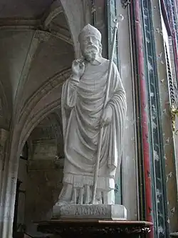 Aignan is credited with doing much to save his city from Attila's hordes, who had avoided Paris. Though advanced in age, he helped the populace prepare to defend themselves and traveled to Arles to ask the Roman general Aetius to intervene. Aignan died about 453 at the age of ninety-five. His remains were buried at first in the church of the monastery of Saint Laurence, of which he had been abbot, but were later moved to the church of the monastery of Saint-Pierre-aux-Bœufs, which was afterwards renamed as a token of veneration as the church, and afterwards abbey, of Saint Aignan.[5] Some of his relics were burned by the Huguenots in 1562; the surviving parts are in a carved wooden shrine in the church of Saint Aignan.